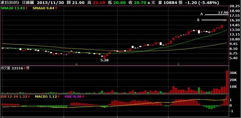 以凌巨(8105)而言,假設發現時已經飆漲一大段了,打算買在2015/11/4的收