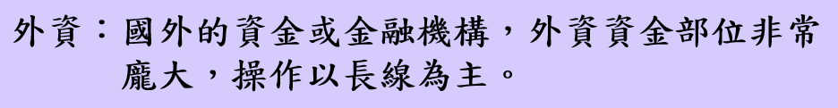 外資:國外的資金或是金融機構。因為外資的資金部位非常龐大,無法在台股短進短