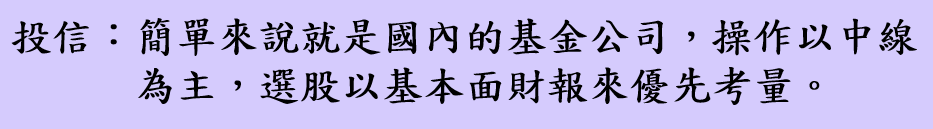 投信:投資信託公司,簡單來說就是國內的基金公司。投信的資金部位會依基金規模