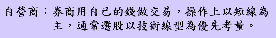 自營商:券商用自己的錢做交易。自營商的資金部位和外資投信相比的話,資金部位